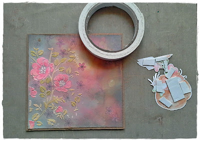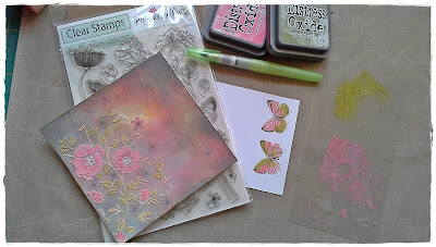 here. I've printed her onto kraft card and coloured her with pencils. The background was made with PanPastels. Next I stencilled some leaves with iridescent paste and once it was dry added some colour with alcohol markers. You can find all the details on