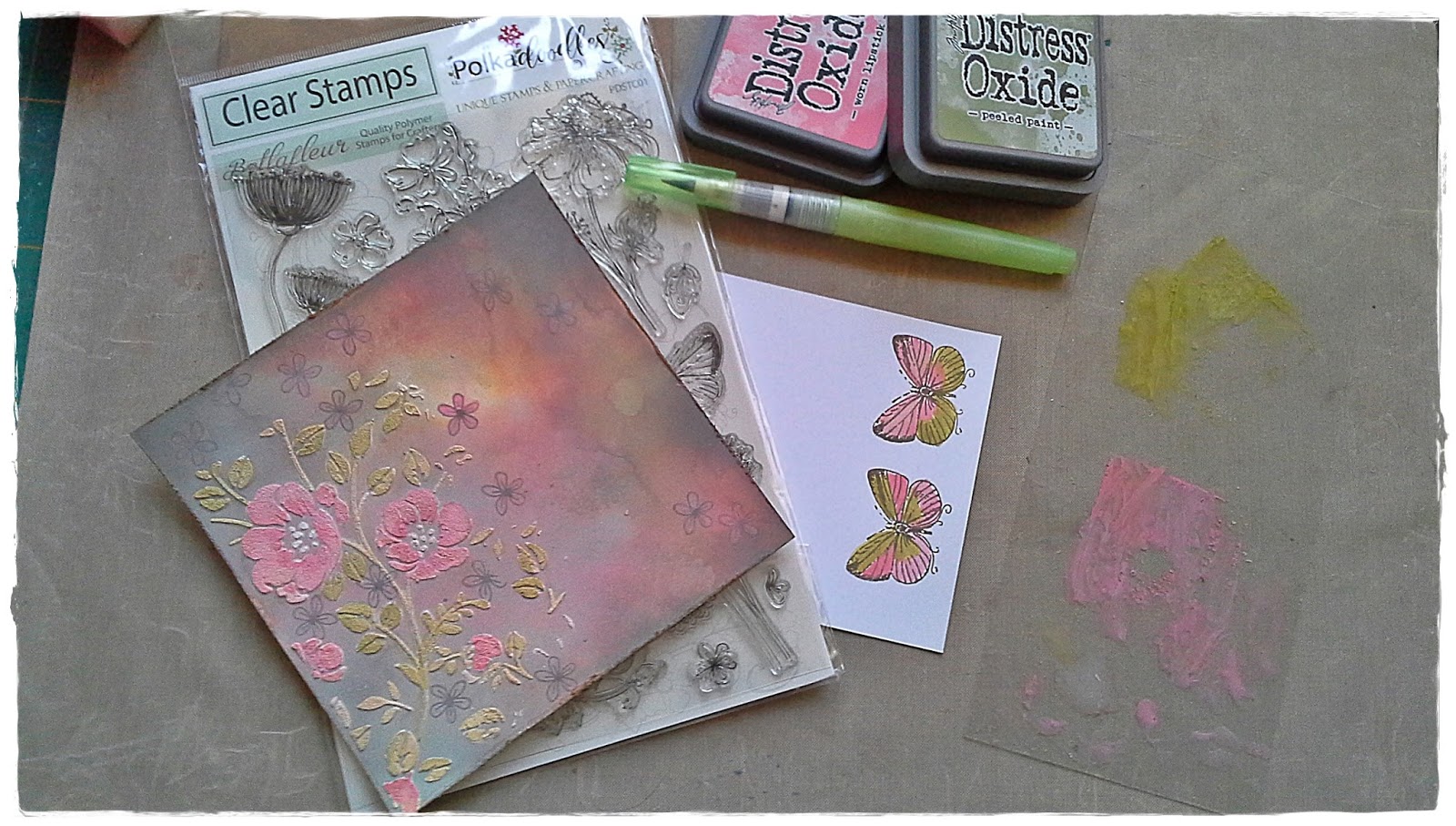 Polkadoodles. I ripped and glued printable background papers onto mixed media strength card with Gesso. Once dry I layered up acrylic and water sprays, before adding some stencilling with Pan Pastels. Then I glued these wonderful large butterflies from another printable into place with a feel-good quote, once dry I added some colour with more Pan Pastel and colouring pencils to blend them in before going around the edges with a black pen.