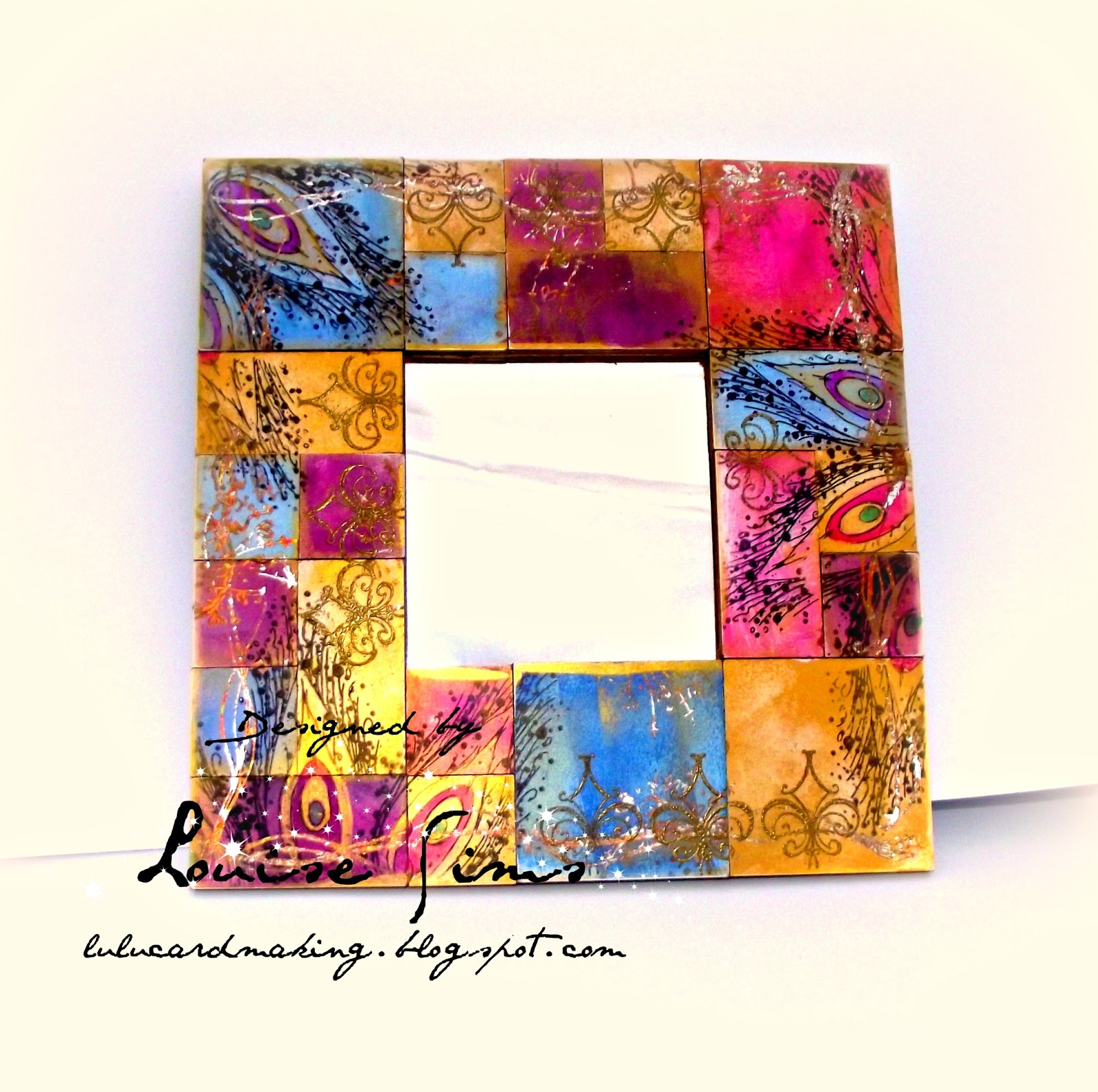 A while back I shared the initial making of my project using stampbord and pan pastels (see HERE), so now is the time to share my finished project. Using the stampbord, I created a frame and added a mirror to the centre. The outside has been decorated with pan pastels, embossing powders using the Regal Peacock soup stamp set from Polka Doodles.