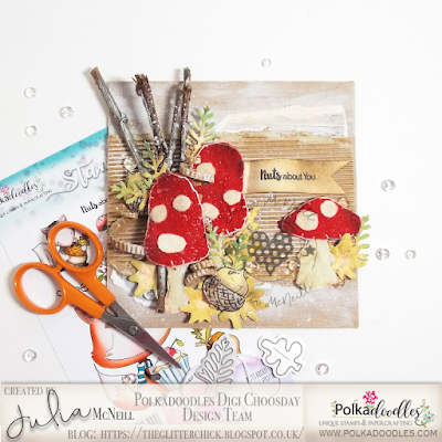 Julia I there I have made a little mixed media card, I actually went for a walk and picked up some sticks especially for this project. I also used some packaging to create a textured background. The card was inspired by Nikky's gorgeous new Critters collection which you can find here