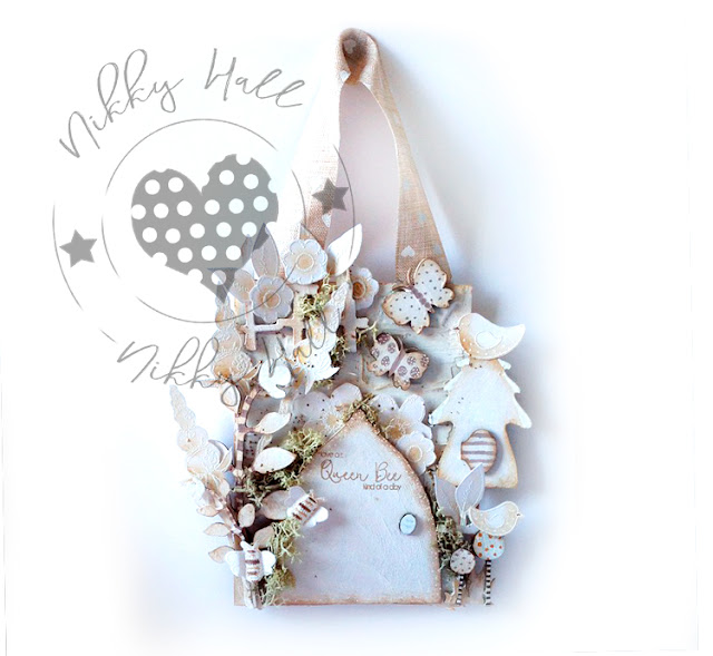 Nikky...I've used the fab Chipboard fairy door kit for this project, combined with our Posydoodles stamps. I find you barely need to add anything to the chipboard anyway, but all I did was paint it with gesso and then add a little Vintage Photo distress ink to the edges and glue down all the pieces, tucking in a little reindeer moss along the way. I stamped flowers and embossed with white embossing powder then just added a sprinkle of my fave Frantage powders and that was it...