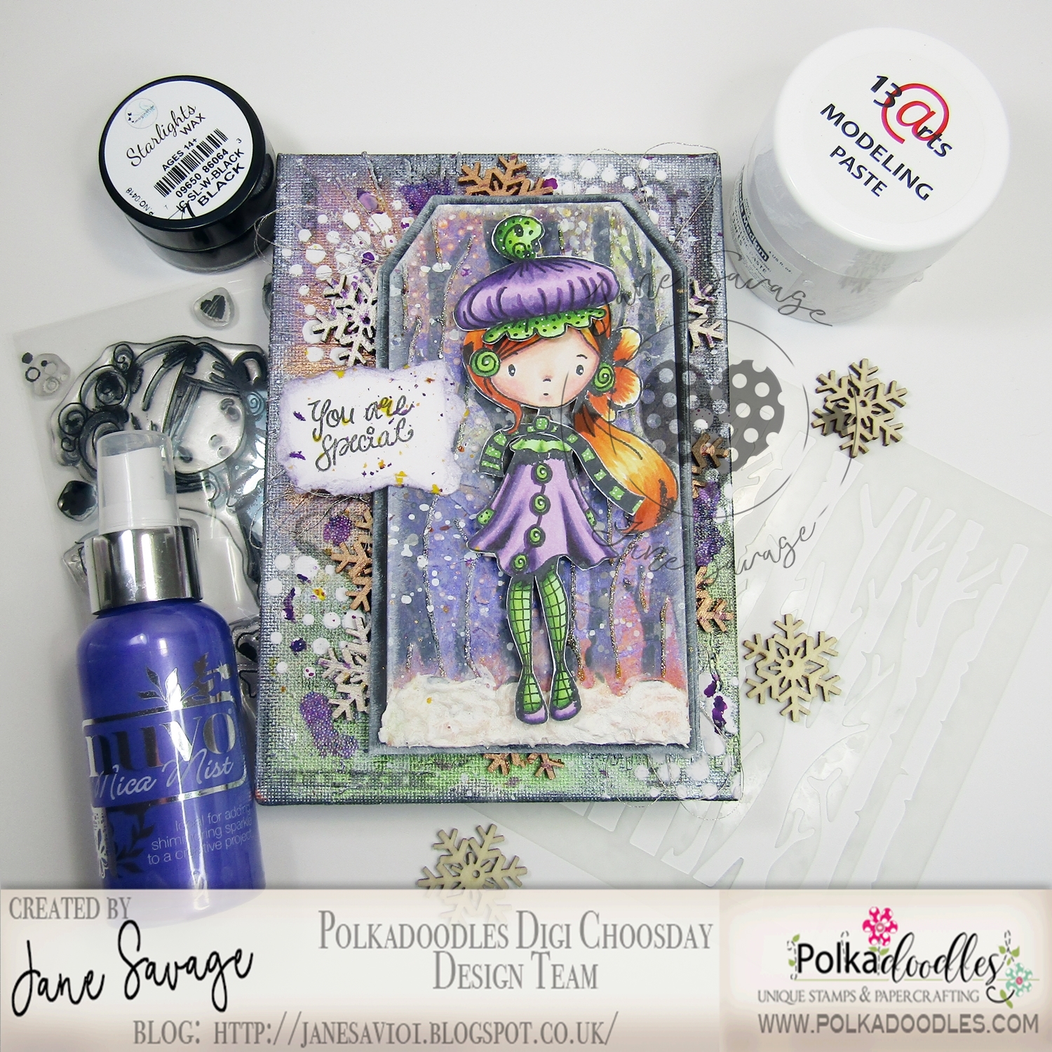 Jane - I took a small canvas and covered it with texture paste, mica sprays and some of the fabulous Polkadoodles Clear Stamps, then created a tag for a 'walk in the winter' theme.