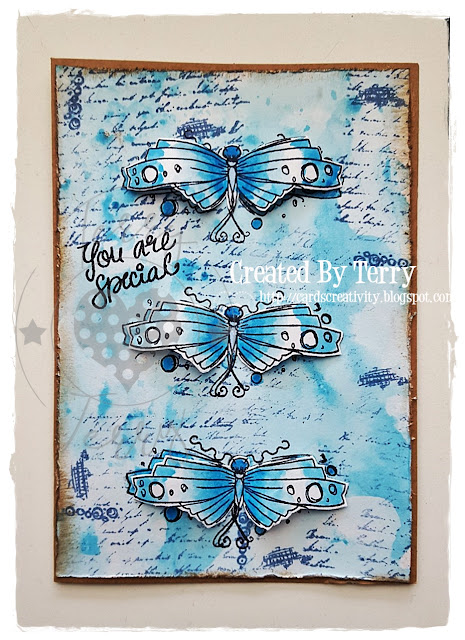 Terry: I have made my first Christmas card for your inspiration. I worked on the background with black acrylic paint, when it was dry I played with Purple, Blue and White Acrylic Paints. I have stamped the cute Robin Branch Stampset, this cute stamp comes with a Die set too did you know?? isn't it just fabulous....This time I used only the stampset. And the little stars that I embossed are from the Winter Flurries Stamp Set. The branch is from the Robin Branch Stampset too and I colored it with Pencils and after that I played with glitter frost. And last but not least I stamped the Season's Greetings and embossed it with white embossingpowder.