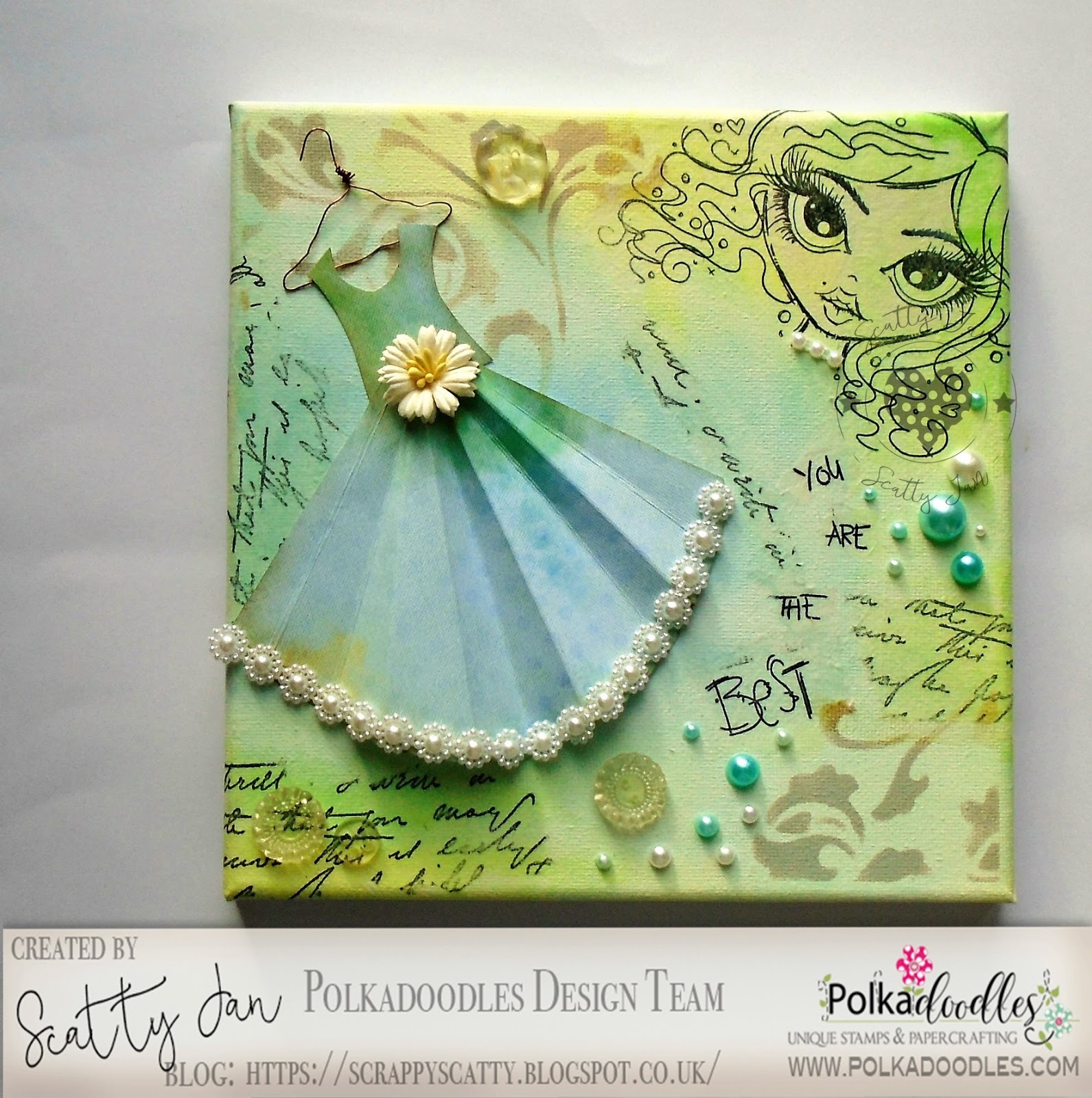 Jan I have recently discovered my love for canvas's ~For this one I painted over with Ecoline's , then using rice paper and stamps , a script stamp , Stencil with Oxides ,some glass buttons, a few pearls. I made the hanger from flower wire , made a paper dress and attached a flower and some bling