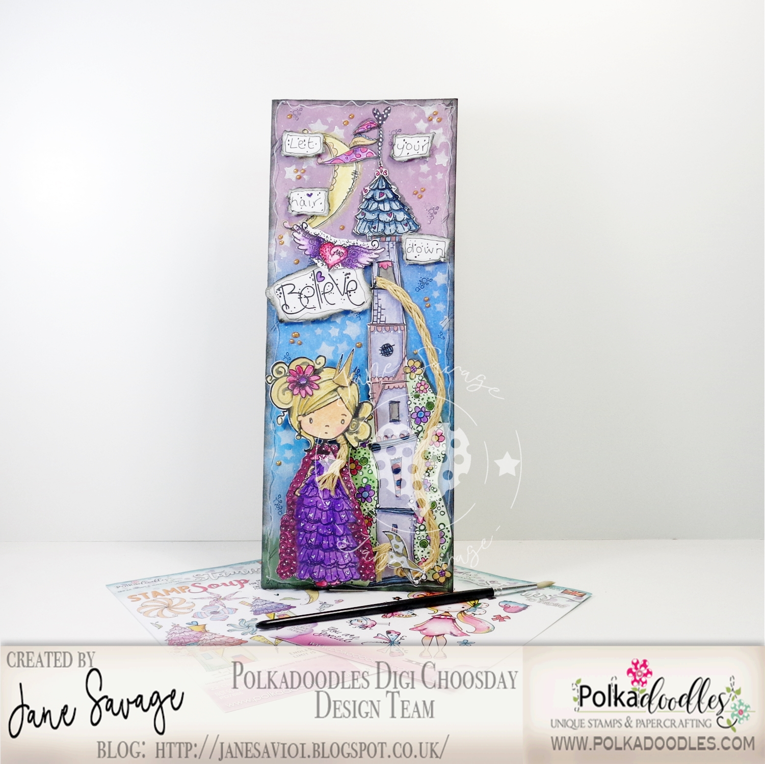 Jane - Once upon a time there was ..well a piece of greyboard depicting a 'girl power' version of the Rapunzel story!! I used many gorgeous Polkadoodles goodies for this make and the list is below.