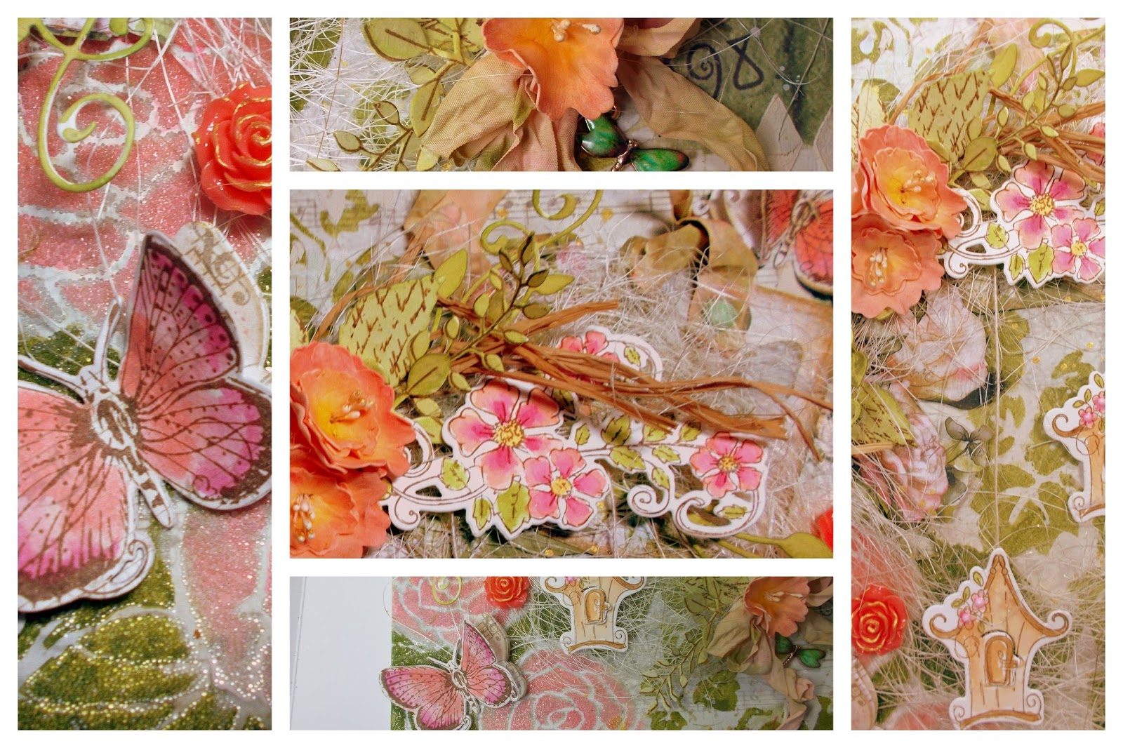 Next assemble the die cuts and add some raffia, angel hair and a few resin roses highlighted with gilding wax to finish the canvas